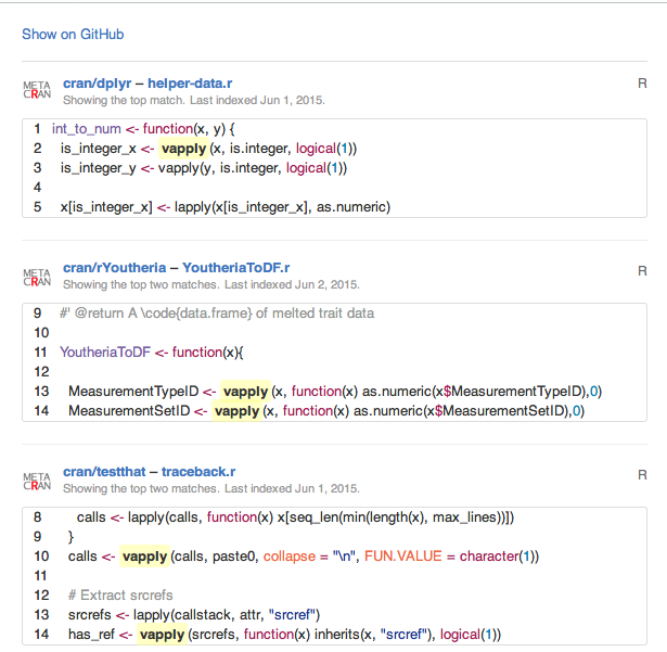 in the viewer pane (and similar with ghelp("vapply", in_cran=FALSE)). Clicking the top link will take you to the search results page on GitHub (in your default web browser), and all the other links will pop out to a browser as well.