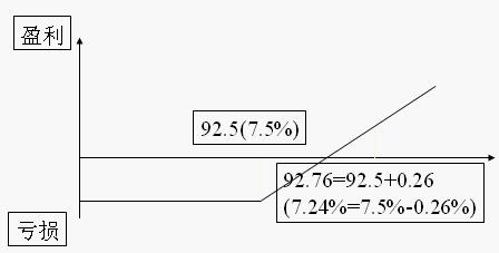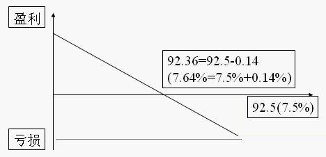 看涨利率期货期权的平价=商定价格+期权费,见下图(利率看涨期权买者的盈亏曲线):