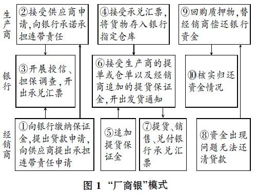 “厂商银”业务具体流程参见图1。在“厂商银”模式下,银行能吸收保证金存款及派生存款,增加贴现等票据业务的收入;对生产厂家来说,能实现先款后货,减少应收款项,加快资金回笼速度,降低财务成本,稳定销售渠道,借银行授信将经销商纳入自身的销售网络,支持厂家迅速扩大销售规模和市场份额,并且避免竞争者蚕食下游客户;对经销商来说,解决了企业短期内融资难的问题,缓解了资金压力,加快了资金周转速度,同时通过银行承兑汇票稳定了与生产厂家的关系,保障了自身的供货渠道,取得了商品经销权,并能争取到生产厂家更大的返利。