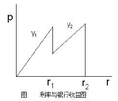 导致这种反常状况发生的原因是金融市场上严重的信息不对称,银行不能够了解借款人和项目真实情况(包括借款人的信用状况、资产状况、项目的风险程度),在这种情况下,它通常会采用一个低于市场出清的利率作为筛选工具,将那些风险高的项目和企业配给出去。如果银行提高利率,会使风险低、收入稳定、还款能力强的企业退出金融市场,此时金融市场上剩下的是那些项目风险大、收入不稳定、还款意愿不强的借款人,这使得其回收贷款本息的风险加大、预期收益下降,如下图所示,纵坐标p表示预期收益,横坐标r为贷款利率。当利率为r1时,市场处于均衡状态,所有的借款人都申请贷款,银行的收益曲线为y1;当利率提高到r2,低风险的借款人退出信贷市场,高风险的借款人继续申请贷款,此时银行的收益曲线为y2,y1和y2没有很大改善,但是银行的风险却在增大。为了降低风险、维持稳定的利润,银行会采用一个低于市场均衡的利率对信贷市场上高风险的借款人进行配给——那些高风险的借款人不管出多高的利率也得不到贷款。