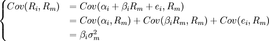 在上式中,我们注意到αi是一个常量,因而Cov(αi,Rm) = 0;而公司特有的成分独立于整个市场的成分,因而Cov(ei,Rm) = 0。从而有: