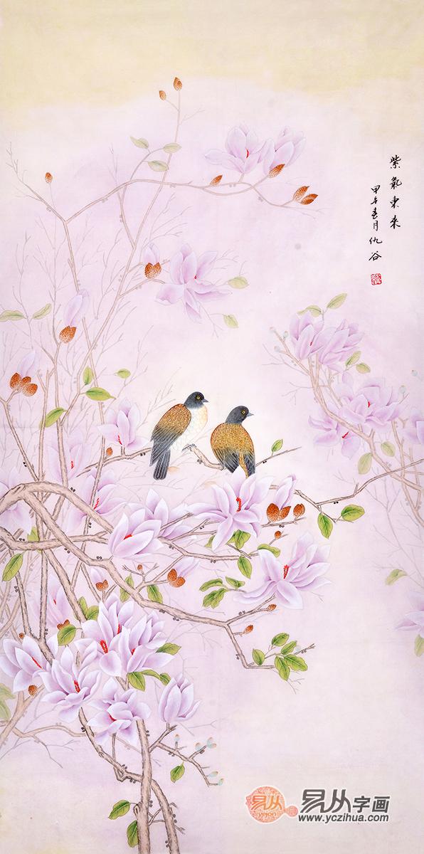 国画兰花作品鉴赏与选购一:仇谷四尺竖幅花鸟画玉兰双侣《紫气东来》 作品来源:易从字画商城花鸟画