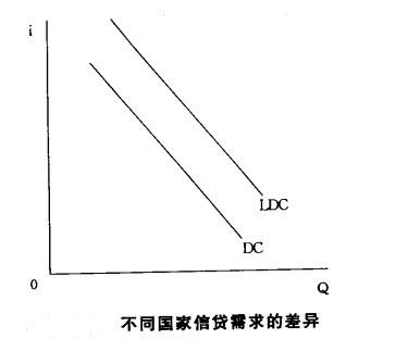 无论是对于发达国家还是发展中国家,国际资本市场都是有条件国际清偿力的重要来源。但国际资本市场对发达国家和发展中国家并非一视同仁,而是有所偏向的。国际资本市场之所以会形成这种偏向,这是由其特殊的市场供求结构决定的。发达国家与发展中国家对私人国际信贷的需求并不完全一致。一般说来,发展中国家由于存在对外来资源的紧迫需求,而外汇短缺状况又至为严重,因此,其信贷需求应该大于发达国家。实际情况也确实如此。统计数字明白无误地表明,发展中国家从国际商业银行获得的贷款数量及国际债券发行量远远低于发达国家,而支付的利率却大大高于发达国家。这就是说,在其他条件相同的情况下,即使是在同样的利率水平上,发展中国家的信贷需求也要大于发达国家。反过来说,发展中国家为了获得与发达国家等量的信贷,它们支付的利率必然高于发达国家。所以,在图像上,发展中国家的信贷需求曲线(LDC)便落在发达国家曲线(DC)的右边(见图1,i表示利率;Q表示信贷数量)。