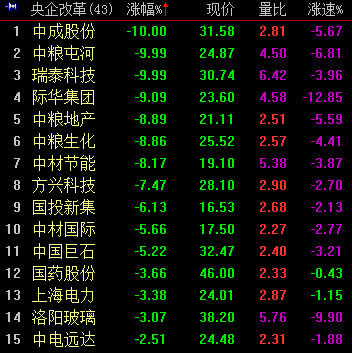 9:41,央企改革跌3.59%,中粮生化、国投新集等6股跌停。