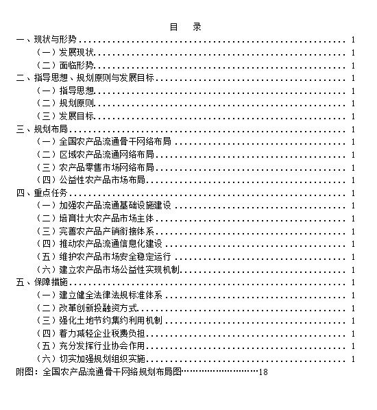 为引导农产品市场在新型工业化、信息化、城镇化、农业现代化加快推进形势下合理布局,提升农产品市场服务功能,构建高效畅通、安全规范、竞争有序的农产品市场体系,编制此规划。 本规划依据《中共中央国务院关于全面深化农村改革加快推进农业现代化的若干意见》(中发〔2014〕1号)、《国务院办公厅关于促进内贸流通健康发展的若干意见》(国办发〔2014〕51号)、《国务院关于深化流通体制改革加快流通产业发展的意见》(国发〔2012〕39号)、《国务院办公厅关于加强鲜活农产品流通体系建设的意见》(国办发〔2011〕59号)、《全国蔬菜产业发展规划(2011—2020)》等编制。 本规划中的农产品主要指鲜活农产品[1]。农产品市场包括农产品批发市场和零售市场。规划期为2015-2020年。 一、现状与形势 (一)发展现状。 1.市场规模不断扩大。2014年,我国鲜活农产品总产量为12.4亿吨,同比增长3%。[2]随着农产品产量的增加,我国农产品市场交易规模不断扩大。全国农产品批发市场成交额达39785.3亿元,同比增长6%。 2.基础设施逐步完善。2014年,我国三分之二的农产品批发市场建有检验检测中心,53%的市场建有信息中心,42%的市场建有废弃物处理中心,29.8%的市场建有电子结算中心。全国冷库总容量3320万吨,公路冷藏车7.5万辆,同比增长分别为24%和39%。 3.市场主体多元发展。在国家一系列惠农、支农政策支持下,各类农产品市场主体快速发展。2014年,全国共有农产品批发市场4512家,农业产业化龙头企业超过12万家,农民合作社116万个。 4.流通模式多样并存。随着经济社会的发展,农超对接、电子商务等新型流通模式快速发展,农产品流通模式日益多样化。目前“农超对接”在农产品流通中的占比已达15%,超过1000家连锁企业与约1.6万个农民合作社实现对接。2014年全国农产品电子商务交易额超过870亿元,电子商务成为农产品流通创新的重要推动力。 总体上看,覆盖城乡的农产品市场体系已基本形成,但仍处于初级发展阶段,市场发展缺乏统筹规划、布局不合理,组织化和标准化程度低,市场信息不对称,市场制度建设滞后等问题依然存在。 (二)面临形势。 随着我国经济发展进入新常态,农产品市场体系发展过程中,既存在“生产小农户、运输长距离、销售大市场、消费高要求”的旧有矛盾,又面临新型工业化、信息化、城镇化和农业现代化快速推进的新要求和新挑战。 一是新型工业化、城镇化推动农产品市场格局深刻变化。随着我国新型工业化和城镇化进程的不断推进,大量农村人口进城务工和落户,农产品消费逐渐向经济发达地区集聚,消费总量不断增长,城市农产品自给率大幅下降,农产品市场格局发生深刻变化。大规模、跨区域、反季节、长距离流通需求快速增长,在给农产品市场体系发展带来机遇的同时,也提出了新的要求和挑战。 二是新型农业现代化加速农产品市场转型升级。随着农村综合改革的不断深入,农业现代化步伐逐步加快,农业生产由传统、粗放经营向现代、集约经营转变。这就要求农产品市场在硬件设施、组织方式、流通方式和交易手段等方面加快转型升级,更好发挥流通的基础和引导作用,以适应新型农业现代化的要求。 三是新型信息化促进农产品流通模式不断创新。随着移动互联网和物联网等技术在农产品流通领域的应用和发展,流通方式不断创新,传统的农产品流通模式受到挑战,电子商务等新型方式在农产品流通中发挥着越来越重要的作用。“互联网+”成为创新农产品流通模式、密切农产品产销衔接、推动农产品市场体系健康发展的重要力量。 四是消费结构升级要求农产品市场建设量质并重。随着城乡居民收入水平提高和生活质量的提升,我国农产品消费结构持续升级并趋于多样化,鲜活农产品的市场需求潜力将进一步释放。同时,消费者也越来越注重农产品的安全和品质,农产品市场体系建设的目标从保供为主向量质并重提升。 二、指导思想、规划原则与发展目标 (一)指导思想。 深入贯彻党的十八届三中、四中全会精神,充分发挥市场在资源配置中的决定性作用,同时更好发挥政府作用,厘清中央与地方事权,科学规划农产品流通网络布局,加强基础设施建设,推进流通方式创新,加快制度建设,构建与新型工业化、信息化、城镇化和农业现代化相适应的农产品市场体系,促进全国农产品流通产业健康发展。 (二)规划原则。 1.统筹规划,分级实施。坚持立足当前和着眼长远相结合,综合考虑人口分布、交通条件、产业布局等因素,统筹规划农产品市场建设,优化农产品市场结构和布局。中央负责规划全国农产品市场体系建设,地方负责规划本行政区域内农产品市场体系建设,并与相关省市统筹协调跨区域农产品市场体系建设。 2.市场运作,政府引导。处理好政府和市场的关系,调动企业积极性,引导社会资本参与农产品市场体系建设;加快转变政府职能,营造良好的市场环境。形成企业为经营主体,政府规划引导、有效监管和适度调节的发展机制,推进农产品市场体系健康发展。 3.科学发展,鼓励创新。促进各类农产品市场协调有序发展。健全产销衔接机制,促进农产品市场与农业生产、城镇化建设的统筹协调发展。坚持新建与改造并举,不断创新发展理念,推进农产品流通方式创新、管理创新、组织创新和制度创新。 4.完善功能,体