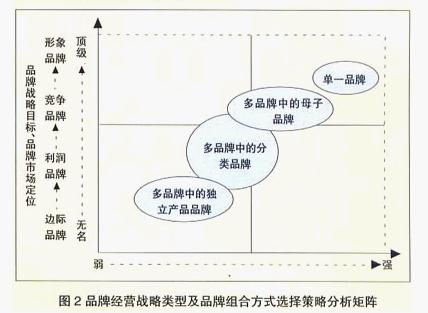 要匹配企业实施品牌战略的目标和品牌市场定位、企业自身条件(如企业规模与实力、企业信誉、产品种类)等因素,综合考虑各种品牌战略类型和品牌组合方式的优劣势、适用性,进行比较选择。策略分析矩阵如图2所示。