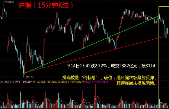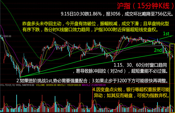 中午收盘,沪指跌2.53%,报3036,成交下滑至1133亿元,振幅骤降至1.77%,中盘钝化走势,3000点附近激烈强势变盘权。但限于分时微观走势、量能、振幅,以及各板块分化指标来看,银行、保险等超权重股超短线更可能脉动,而如果逃逸下跌,则谨慎视为沪指直接弃权。潜在的超短线反攻选项也并不多,3000点承压继增,变盘点尖锐,投资者宜加强风控管理。