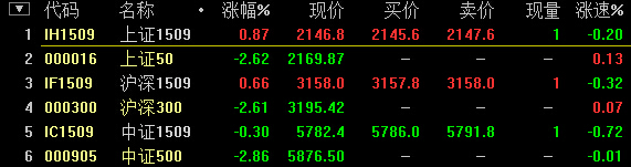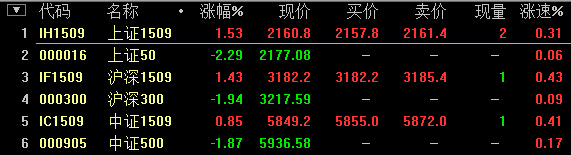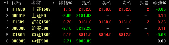 9:19,IH1509涨0.97%,IF1509涨0.77%,IC1509跌0.56%。