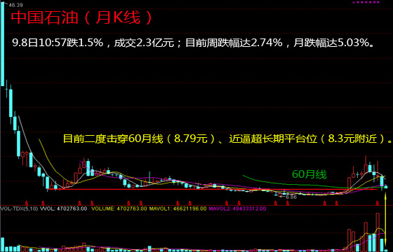 13:24,沪指跌幅收窄至1.67%,报3047,两桶油掀一波直线拉升,中国石油[-0.24% 资金 研报]涨1.4%,报8.63元,8月下旬以来,数次历史性破位——跌破60月均线8.78元,目前处于第三次紧急修复中。