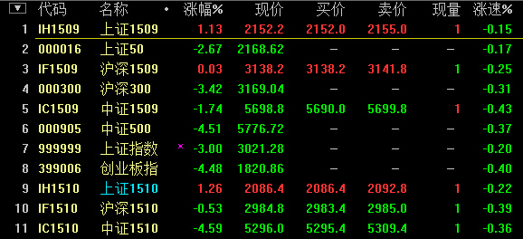 15:15中金所收市,“新老”主力合约延续午后分化态势:本周五交割的IH1509涨1.49%,IC1509跌2.35%;而即将晋升为主力合约的IH1510与1509步调一致,涨1.65%;IC1510则大跌4.32%。