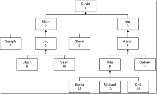 注:如何对树型结构数据表进行查询、遍历在这里不进行展开,可参考《Inside Microsoft SQL Server 2005 T-SQL Querying》一书。本例及以下两小节中的例子,引用自《Inside Microsoft SQL Server 2005 T-SQL Querying》,但同样适用于其他关系数据库。