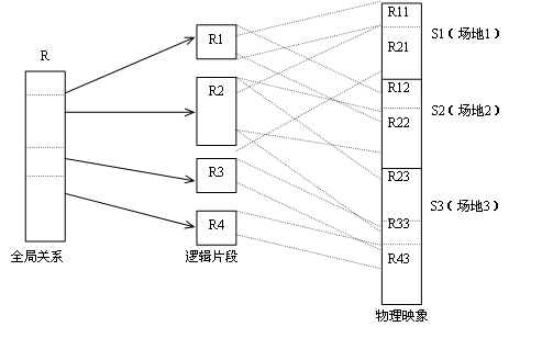 (2)分割式:所有数据只有一份,它被分割成若干逻辑片段,每个逻辑片段被指派在一个特定的场地上。