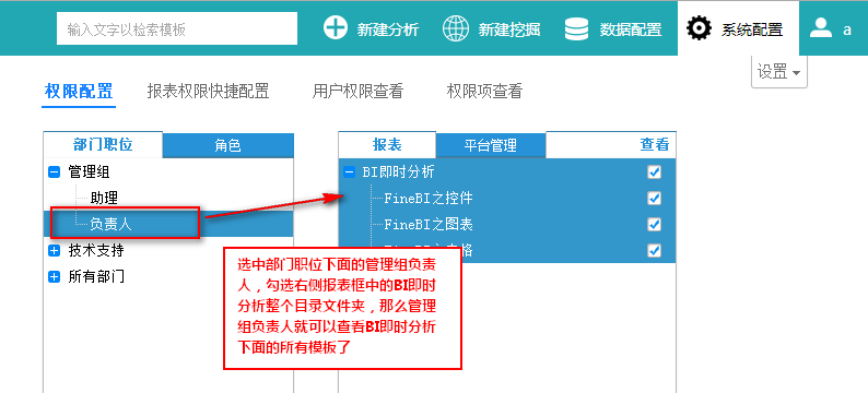 点击系统配置>权限管理,给同步数据集用户添加访问BI即时分析的权限,如下图,给管理组负责人可以访问BI即时分析目录下面的所有的BI分析: