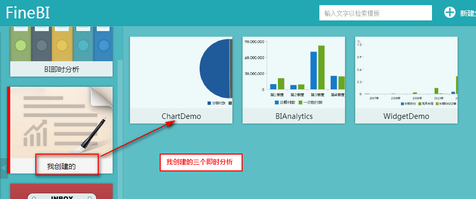 在前面我们保存了3个BI即时分析,即BIAnalytics,ChartDemo和WidgetDemo,点击BI>我创建的,可以看到这3个BI即时分析,如下图: