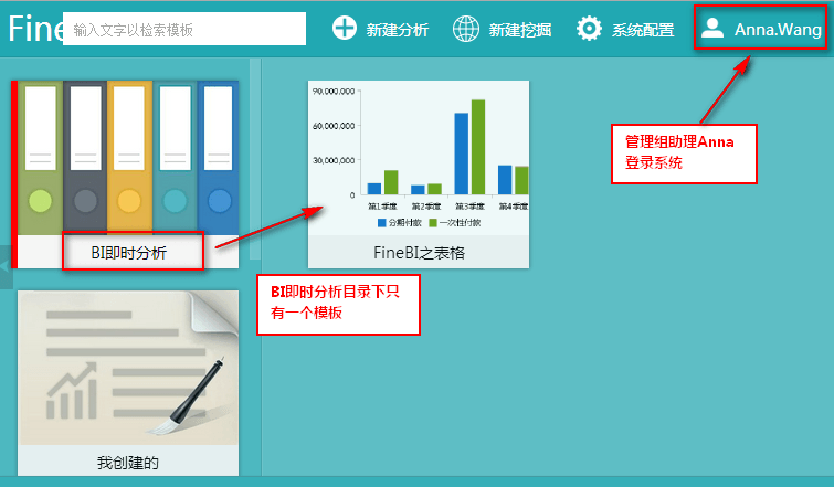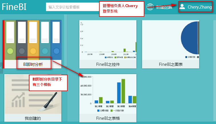 如下图,使用管理组负责人的用户(Cherry)登录,其BI即时分析目录下可以看到三个模板: