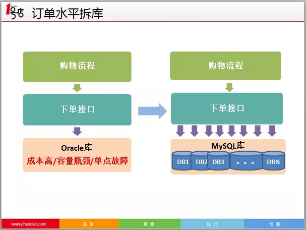 早在2013年,1号店实现库存的水平拆分,2014年又一举完成订单水平拆库&去Oracle迁Mysql项目。