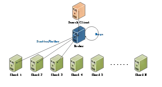 如上图所示,分布式搜索中有两个主要组件:Shard Searcher和Broker,其中Shard Searcher与单机搜索引擎类似,基于Lucene/Solr完成基本的搜索任务。Broker负责把针对整个索引的搜索请求转化为针对单个Shard的搜索请求,它把Shard搜索请求分发给各个ShardSearcher,并且把各个Shard的结果进行合并,生成最终的结果。