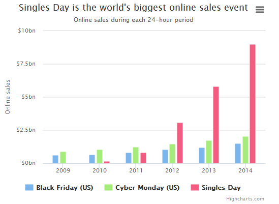 双十一已经把美国的黑色星期五、网络星期一远远甩在了后面。不信,你看下图: