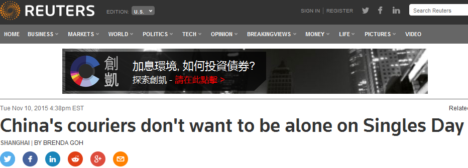 No.5 路透:快递行业不甘寂寞,也想在“双十一”脱单