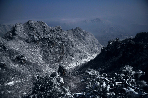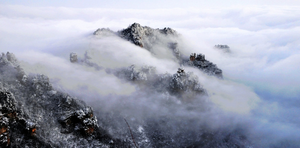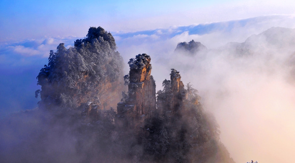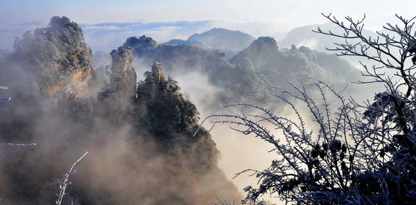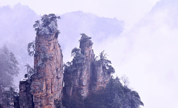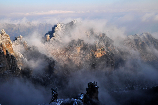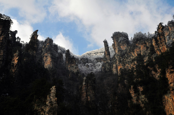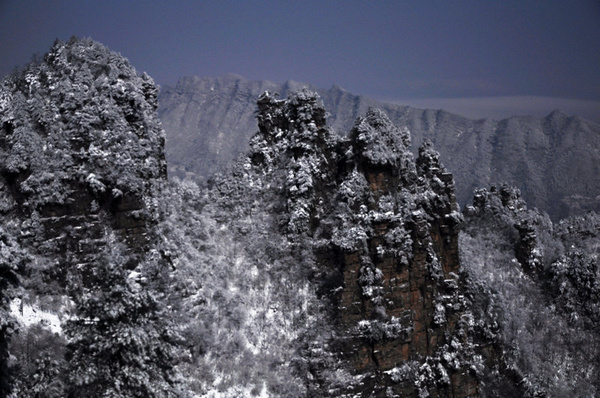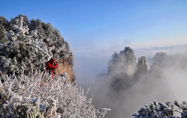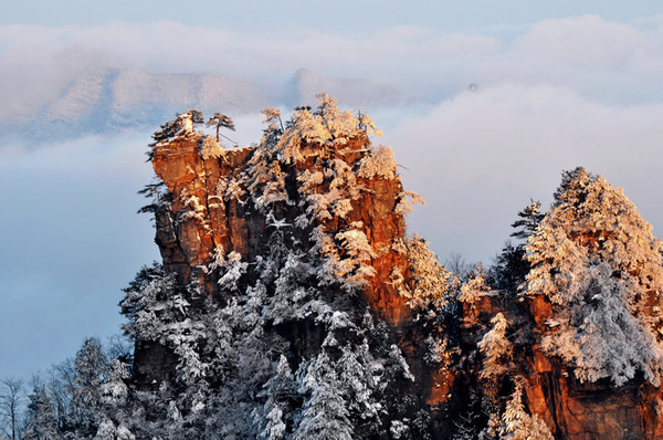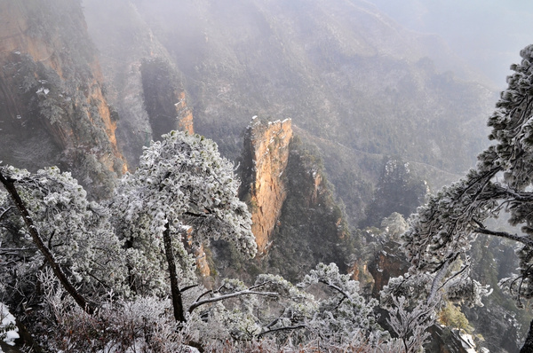 张家界天子山之雪,没有北国雪的豪放,没有南国别处雪的娇柔,它自成一派;它既不哗众取宠,也不矫揉造作,总是与先贤哲人一般,静静地,用自己独特的印记,来昭示自己的存在。