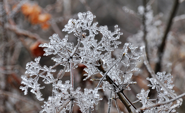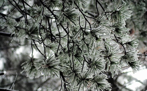 积雪、水汽层层包裹在悬崖旁的树枝上,把树枝压的弯弯的,形成千姿百态的冰挂、雾凇;树枝、树干被冰柱包围,变得冰肌玉骨;树叶、小草和那些来不及凋零的野果,被一层冰层包裹,像一枚枚晶莹剔透的琥珀。