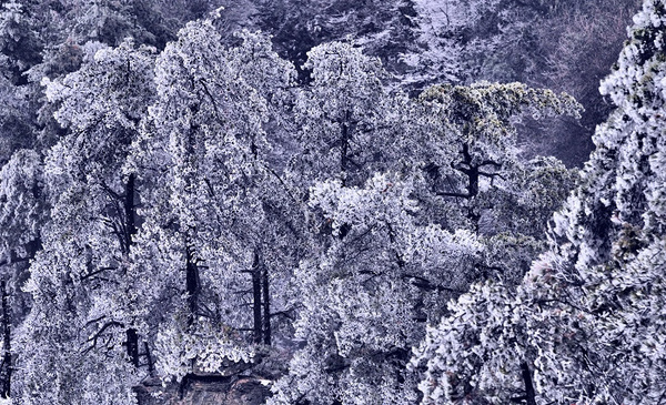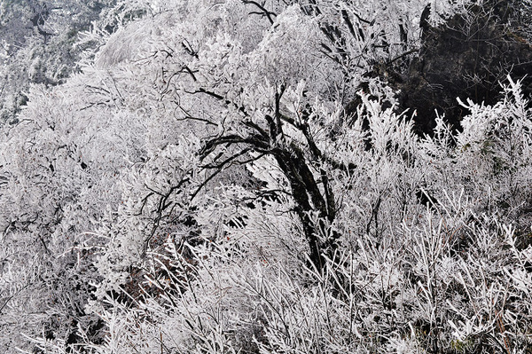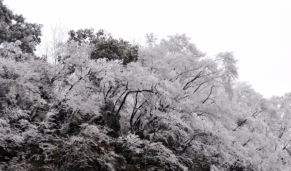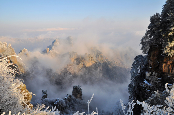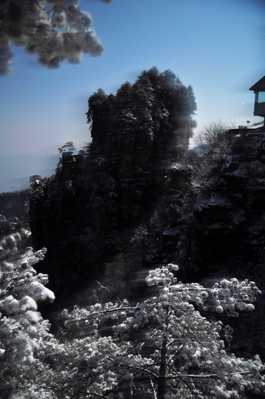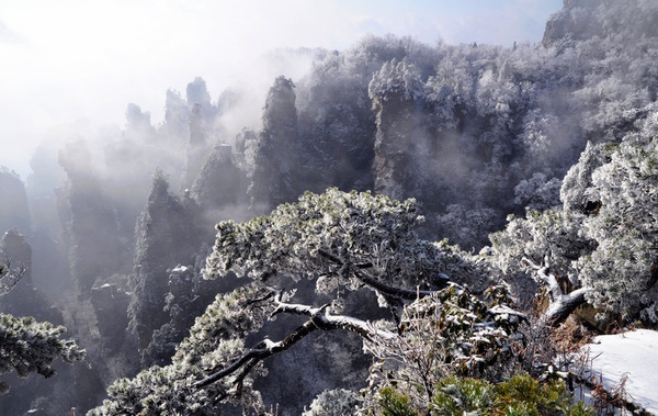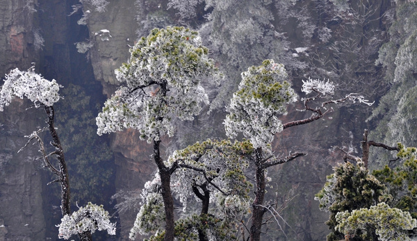 崖下,阳光照射不到的阴影里,所有的树木与岩石顶端,都披上白色的纱衣,银妆素裹千般娇,玉树琼花万分娆,那个无数次欣赏过的熟悉张家界天子山,那个已经烂熟于胸的张家界天子山,此刻消失得无影无踪。