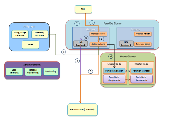4、Master Cluster:配置服务器,保存每个SQL Azure实例的副本所在的物理存储节点信息。