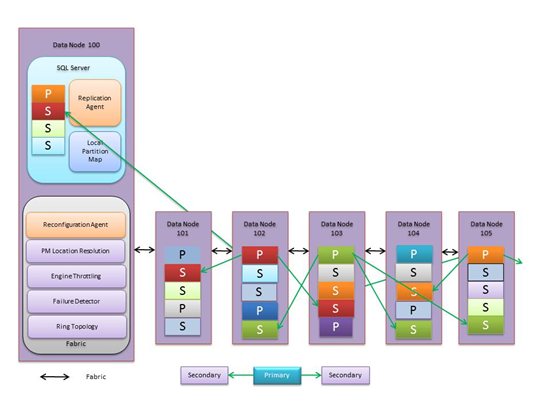 平台层就是存储节点集群,运行物理的SQL Server服务器。客户端的请求通过Front-end网关节点转发到平台层的数据节点,每个SQL Azure实例是SQL Server的一个数据分片,每个数据分片在不同的SQL Server数据节点上存储三个副本,同一时刻只有一个副本为Primary,其它副本为Secondary。数据写入采用”Quorum Commit”策略,至少两个副本写成功时才返回客户端,这样即使一个数据节点发生故障也不影响正常服务。Platform Layer的架构如下: