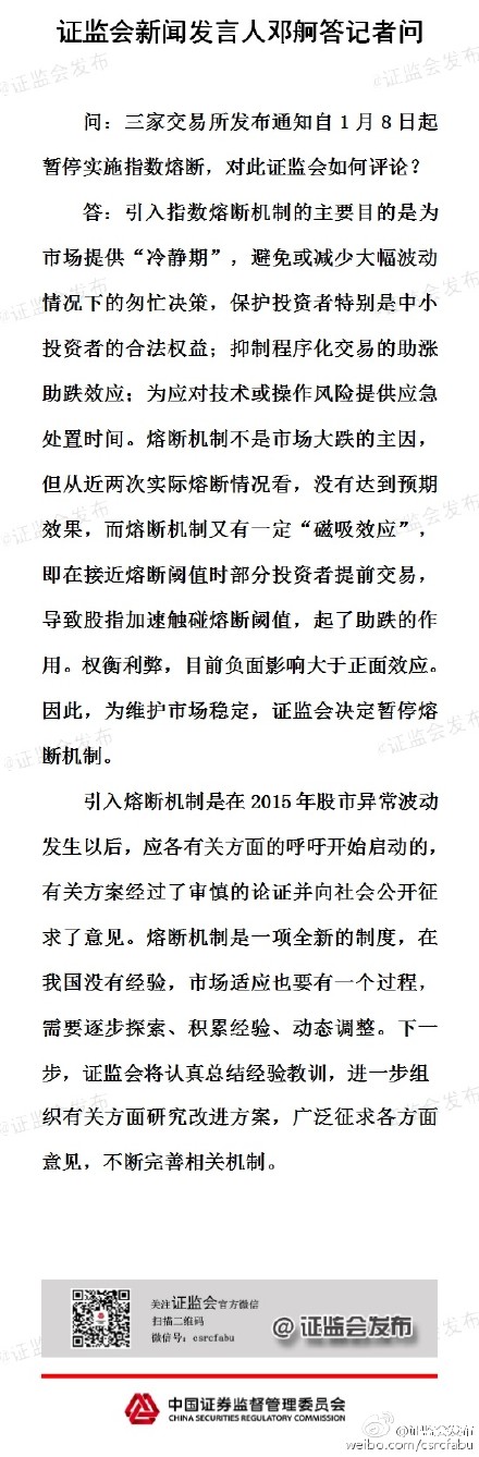 今日晚间证监会在微博发布公告:1月8日起暂停实施A股指数[-7.04%]熔断制度。证监会发言人就相关问题对记者进行了回答。