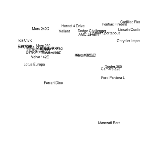 > mds <- cmdscale(dist(mtcars))> plot(mds, type = 'n', axes = FALSE, xlab = '', ylab = '')> text(mds[, 1], mds[, 2], rownames(mds))[color=rgb(255, 255, 255) !important]