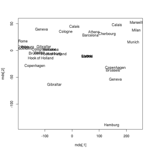 > (mds <- cmdscale(eurodist)) [,1] [,2]Athens 2290.2747 1798.803Barcelona -825.3828 546.811Brussels 59.1833 -367.081Calais -82.8460 -429.915Cherbourg -352.4994 -290.908Cologne 293.6896 -405.312Copenhagen 681.9315 -1108.645Geneva -9.4234 240.406Gibraltar -2048.4491 642.459Hamburg 561.1090 -773.369Hook of Holland 164.9218 -549.367Lisbon -1935.0408 49.125Lyons -226.4232 187.088Madrid -1423.3537 305.875Marseilles -299.4987 388.807Milan 260.8780 416.674Munich 587.6757 81.182Paris -156.8363 -211.139Rome 709.4133 1109.367Stockholm 839.4459 -1836.791Vienna 911.2305 205.930These scores are very similar to two principal components (discussed in the previous, Principal Component Analysis section), such as running prcomp(eurodist)$x[, 1:2]. As a matter of fact, PCA can be considered as the most basic MDS solution.