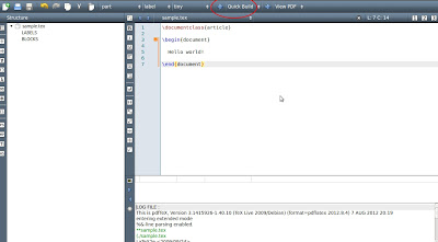 - 接下来使用 File -> Save 将文档保存为一个扩展名为 tex 的文件,然后点击 Quick Build 来编译文档:
