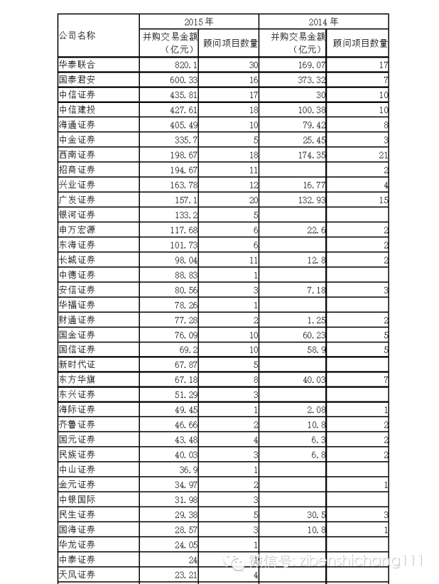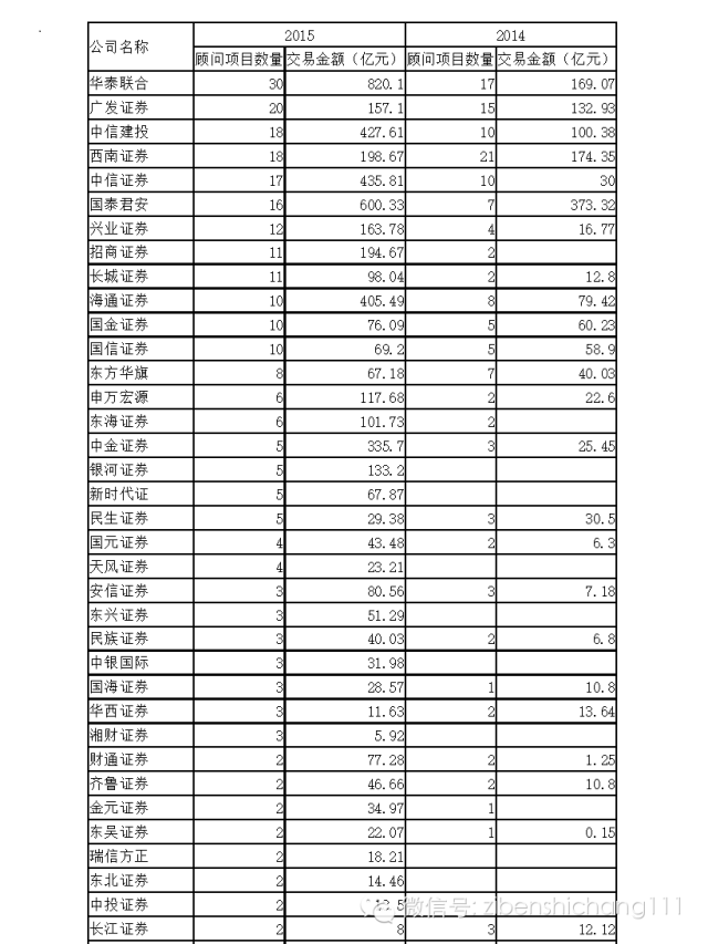 2015年并购重组市场的财务顾问机构发生了很大的变化。华泰联合以服务30个项目和820亿交易规模,无论从顾问服务数量还是并购交易金额都大幅领先于竞争对手。而2014年的冠军西南证券则在2015年排名第四。与此同时2014年表现一般的中信证券和国泰君安2015年在并购市场取得不错的战绩。中信建投、兴业证券、招商证券、长城证券2015年都进步巨大。牛牛金融研究中心发现,由于2015年并购交易市场出现井喷式发展,许多过去难觅踪迹的中小券商也在并购市场分得一杯羹,这样的机构接超过20家,在2014年几乎没有收获一份并购交易订单,但在2015年取得主持了数亿甚至百亿的交易,如银河证券、中德证券、新时代证券等。