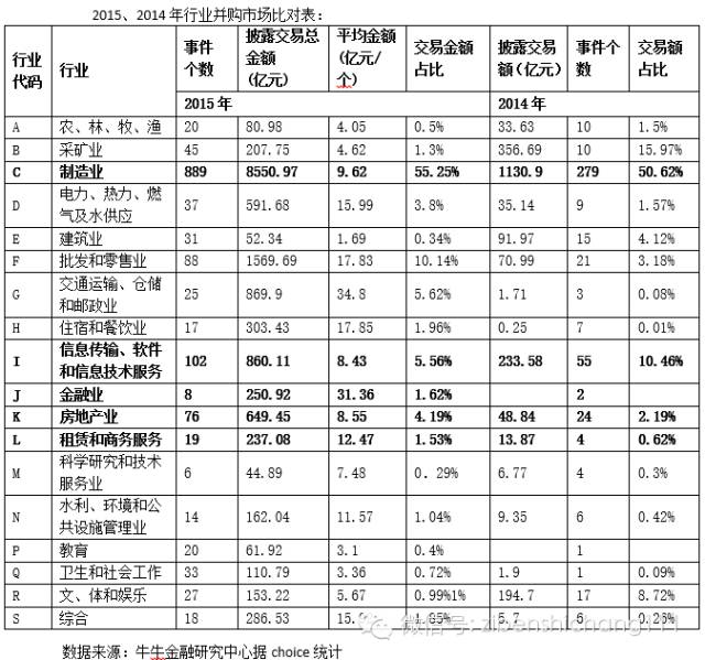 通过对2015年和2014年A股市场的并购数据研究,可以对应中国资本市场急剧变化的概念化炒作热潮。我们从下表关于行业并购数据可以看到,2014年延续前些年矿业投资的热潮,仍居于并购交易行业排名仅次于制造的第二位,占比达15.97%,但到了大宗商品和金属快速下跌的2015年,矿业交易只占到全部并购交易占比微不足道的1.3%。