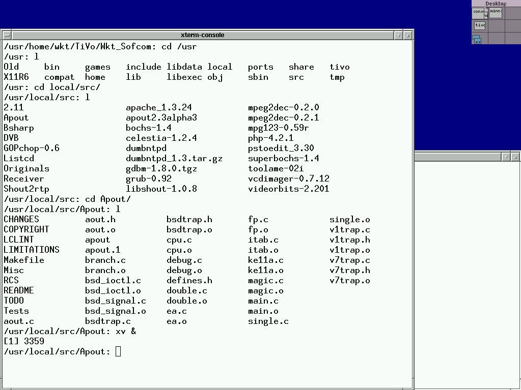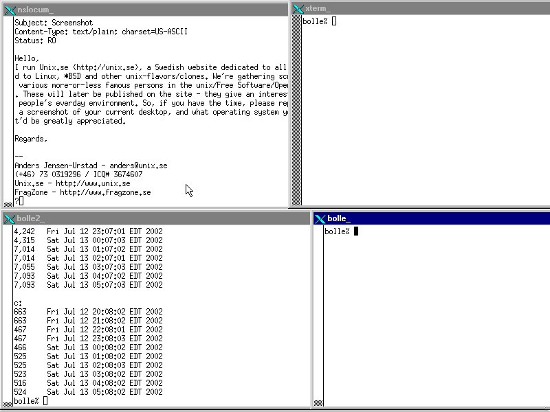 在2002年,Bram主要依赖xterm进行工作,同时使用Netscape来浏览网页。相对于其他人,Bram的桌面已经多了一些色彩,而且设置了xterm中的高亮显示。此外,Bram还打开了KDE状态栏的自动隐藏功能。