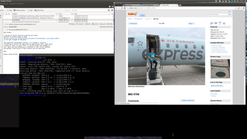 到2015年,Rasmus仍然在使用Linux、终端和浏览器。但是,他开始使用Thunderbird来替代Pine收发邮件。而且,他笔记本中所使用的系统也更新为了带Unity的Ubuntu。