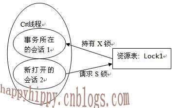 C#程序持有了表Lock1上的X锁,同时开了另一个SqlConnection还想在该表上请求一把S锁,图中已经构成了环路;太贪心了,结果自己把自己给锁死了。。。