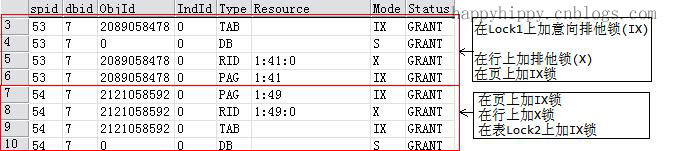 Query1中,持有Lock1中第一行(表中只有一行数据)的行排他锁(RID:X),并持有该行所在页的意向更新锁(PAG:IX)、该表的意向更新锁(TAB:IX);Query2中,持有Lock2中第一行(表中只有一行数据)的行排他锁(RID:X),并持有该行所在页的意向更新锁(PAG:IX)、该表的意向更新锁(TAB:IX);