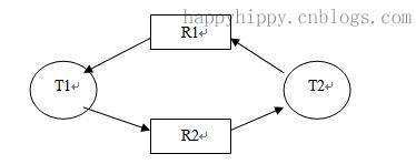 说明:T1、T2表示两个任务;R1和R2表示两个资源;由资源指向任务的箭头(如R1->T1,R2->T2)表示该资源被改任务所持有;由任务指向资源的箭头(如T1->S2,T2->S1)表示该任务正在请求对应目标资源;