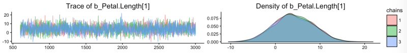 Family: categorical (logit) Formula: Species ~ Petal.Length + Petal.Width + Sepal.Length + Sepal.Width Data: ir (Number of observations: 150) Samples: 3 chains, each with iter = 3000; warmup = 600; thin = 1; total post-warmup samples = 7200 WAIC: 21.87 Fixed Effects: Estimate Est.Error l-95% CI u-95% CI Eff.Sample RhatIntercept[1] 6.90 3.21 1.52 14.06 2869 1Intercept[2] -5.85 4.18 -13.97 2.50 2865 1Petal.Length[1] 4.15 4.45 -4.26 12.76 2835 1Petal.Length[2] 15.48 5.06 5.88 25.62 3399 1Petal.Width[1] 4.32 4.50 -4.50 13.11 2760 1Petal.Width[2] 13.29 4.91 3.76 22.90 2800 1Sepal.Length[1] 4.92 4.11 -2.85 13.29 2360 1Sepal.Length[2] 3.19 4.16 -4.52 11.69 2546 1Sepal.Width[1] -4.00 2.37 -9.13 0.19 2187 1Sepal.Width[2] -5.69 2.57 -11.16 -1.06 2262 1Much more reasonable estimates, errors, effective samples, andRhat. And let’s compare a plot for Petal.Length[1]: