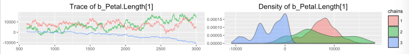 If we were coding in Stan ourselves, we’d have to think about bugs we might’ve introduced, but with brms, we can assume for now that the code is correct. So the first thing that comes to mind is that the default flat (improper) priors are so broad that the sampler is wandering aimlessly, which gives poor results and takes a long time because of many rejections. The first graph in this posting was generated by plot (b1), and it clearly shows non-convergence of Petal.Length[1] (setosa v virginica). This is a good reason to run multiple chains, since you can see how poor the mixing is and how different the densities are. (If we want nice interactive interface to all of the results, we could launch_shiny (b1).)
