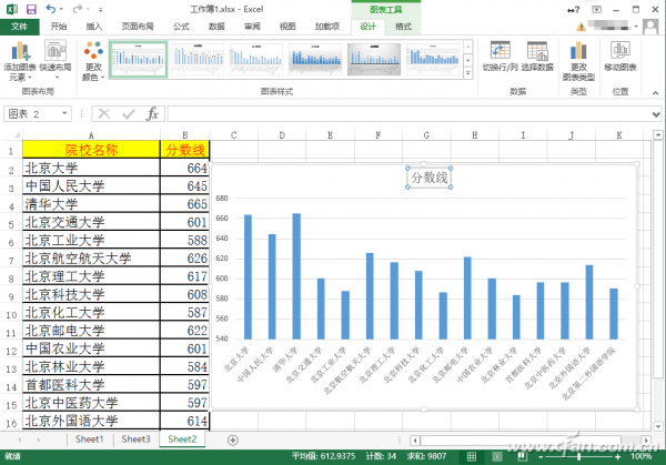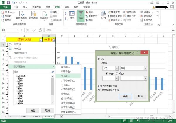 答:其实,通过Excel自带的“数据筛选”功能结合“插入图表”功能即可实现动态图表的制作。以一份大学的录取分数线表为例。这是一份北京部分重点大学某年在某省录取理科生的分数线列表(图14)。选中所有院校和分数线数据,通过“插入”菜单生成一份簇状图。孰高孰低,从这份图表中可以更直观地看出来(图15)。现在需要筛选出分数线在600分以上的学校,且需要按分数从高到低的顺序制作一份柱状图表。这时,点击“数据”选项卡,然后点击“筛选”按钮,随后表格标题栏都自动加上了小三角下拉按钮。点击“分数线”下拉小三角按钮,选择“降序”,再选择“数字筛选→大于”,并在对话框中输入分数线大于“600”分,点击“确定”(图16)。随后,图表范围就变成了满足600分以上且降序排列的学校了。这样制作出来的图表,看起来就比前面制作的更直观了(图17)。适合复杂数据下对特定数据进行选择,突出重点而隐藏不需要的内容。