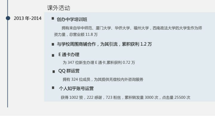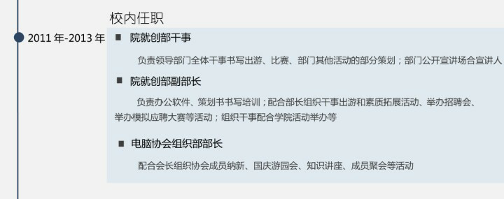 在校内任职的模块里,大家可以发现,每个任职职位下面都有非常具体的事例与之对应,负责了哪些内容做了什么事,都具体的呈现在了上面,具体又不失简洁,这是现在很多应届生简历较为少见的,很多应届生要么写了一大段不知所云,要么干脆只写一个职位就放在上面,干巴巴的。