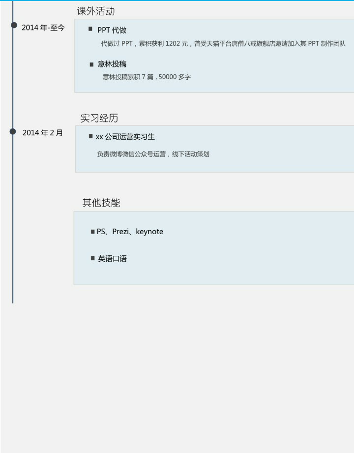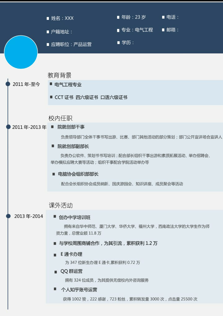 从内容来看,按着顺序可以一眼就的看出主要的内容从上到下依次是教育背景,校内任职,课外活动,教育经历,实习内容,其他技能。十分清晰明了。决定这六个模块的优先级是根据求职意向来划分的,像这份简历应聘的是是产品运营方面的实习生,所以可以适当的将“课外活动”模块在向前靠一点(课外活动里有些内容涉及求职者的运营经历)。