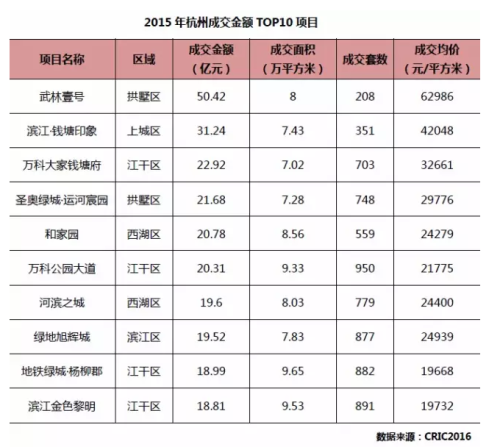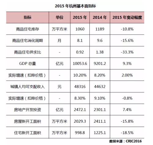 对于杭州市来说,2015年可谓转折性的一年。2014年杭州楼市低迷,整体供大于求,消化周期一度超过24个月,业内集体看空,但2015年市场瞬间由供过于求变为供不应求,去化压力大大减轻;全年房地产成交规模大幅增长,成交金额仅次于上海、北京、深圳位居全国第四;土地市场方面,频有高溢价地块出现,文晖、滨江等热点板块屡破单价纪录;经济基本面也很亮眼,GDP增速达到10.2%,远高于全国平均水平。