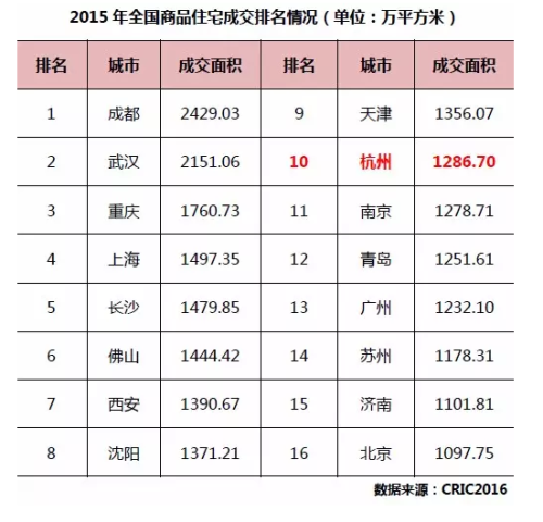 2015年杭州商品房成交1380万平方米,创历史同期新高,与2014年相比大幅上涨43%。其中商品住宅供应量1182万平方米,同比下滑4%,成交达1287万平方米,成交金额为2043亿元,均超过昨天所说的南京,同比分别上涨45%和48%,同比涨幅居二线城市第三。