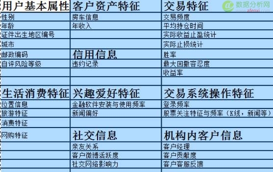 目前业界的个人金融画像主要在金融机构内部数据结合外部数据基础构建。如对原始数据进行特征提取,得到如下客户特征: