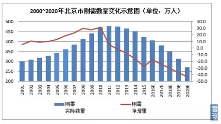 从上表中可以看出,2001~2013年,北京刚需数量在逐年增加,从最初的298万增长到最高点的475万,强大的刚需是北京也是一线城市房价十年大牛市最根本支撑力量。而一旦刚需数量发生趋势性改变,那么支撑北京房价的基础也就不复存在。根据前文可知,到2020年,北京刚需累计下滑幅度超过40%,而刚需对北京房地产市场的贡献度超过8成,是其他任何需求都无法替代的。当刚需需求趋势性长期萎缩之后,北京房地产市场的总需求必然随着大幅下降,而需求是决定房价的最根本因素,因此北京房价必跌!
