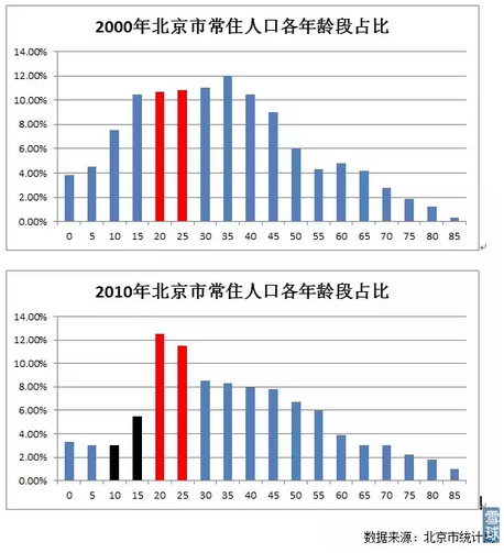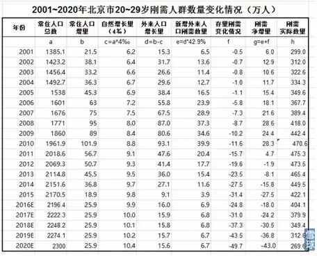 根据北京市人口普查数据,2000年常住人口总数为1363万人,其中20~29岁人群(刚需人口)占常住人口总数比例约为21.5%,即293万人。2010年常住人口总数为1961万人,其中20~29岁人群占比为24%,即470万人。