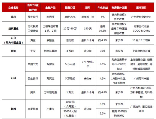 地产派的代表是万科的万民宝、旭辉的旭财宝等。这些项目都是由地产牵头与银行合作,收益不是很高,除了当代置业这种年化收益率最高可以达到39.5%的项目以外,其他项目收益均在4.5%——5%,基本和银行理财产品持平,但会有一些后期的购房优惠。比如万民宝,是由万科地产、民生易贷和中国民生银行三方共同合作打造。投资者通过投资万民宝可以获得预期年化4.5%的收益,同时,此投资者如购买该产品指向万科在广州天河智慧城区域的万科米酷楼盘,还可额外获得特别补贴的1%额外收益及9.8折购房优惠和优先选房权。